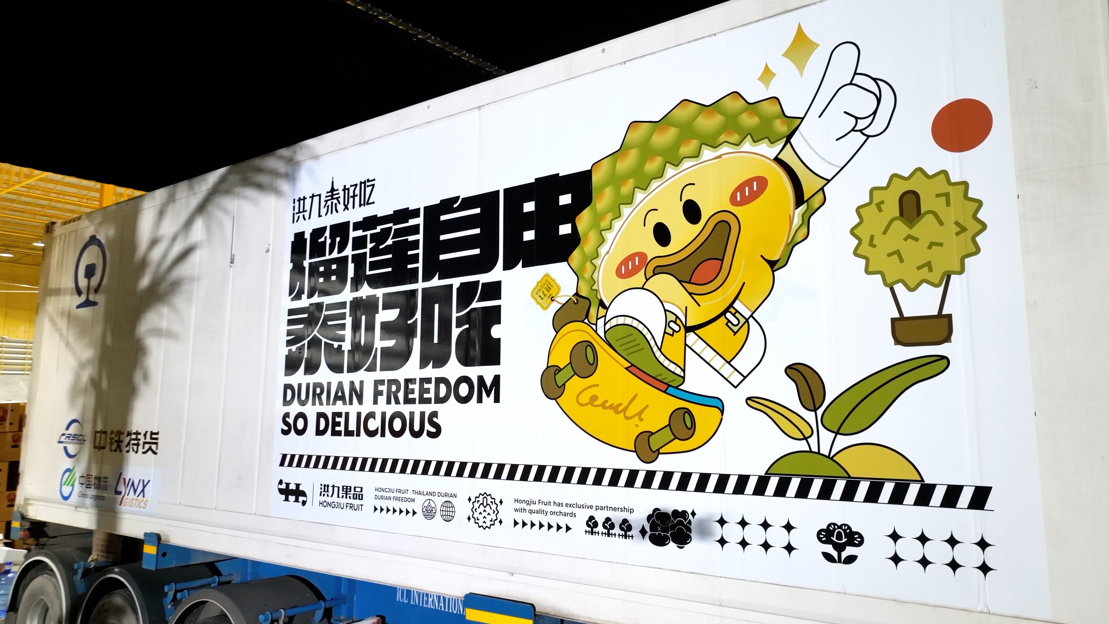 本次专列载运的28柜“洪九泰好吃”榴莲,是洪九果品匠心打造的自有品牌之一,精选自泰国东部榴莲优质产区的特供果园,具有果色正、果肉糯、果香浓的核心优势,平均出肉率在4房及以上。一颗颗“报恩榴莲”将通过“端到端”的先进数字化供应链,直达各个零售终端,洪九果品自主研发的“洪九星桥”全球供应链管理系统,实现了“采、运、销”全业务链的数字化管控。如在货品运输过程中,对在途路线、货柜状态、产品新鲜度、清关进程等数据进行实时监控追踪,最大程度上确保果品的新鲜度,提升了运输效率,让每一颗到达消费者手中的榴莲都质优物美。